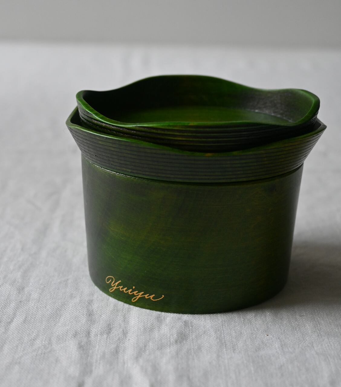 縁の部分には「千筋」と呼ばれる細かい縞模様の装飾を加えています。蓋は2枚のお皿に、本体は器に。用途にあわせて分けて使えるのが魅力です。